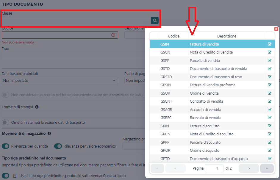 3. Imposta la corretta Classe del tipo documento da creare scegliendola tra quelle proposte nell'elenco.