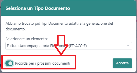 Per poter fare in modo che alle creazioni successive di nuovi documenti venga sempre utilizzato automaticamente il tipo documento selezionato (senza che venga più richiesta la selezione tramite la precedente richiesta) è possibile impostare il flag "Ricorda per i prossimi documenti"