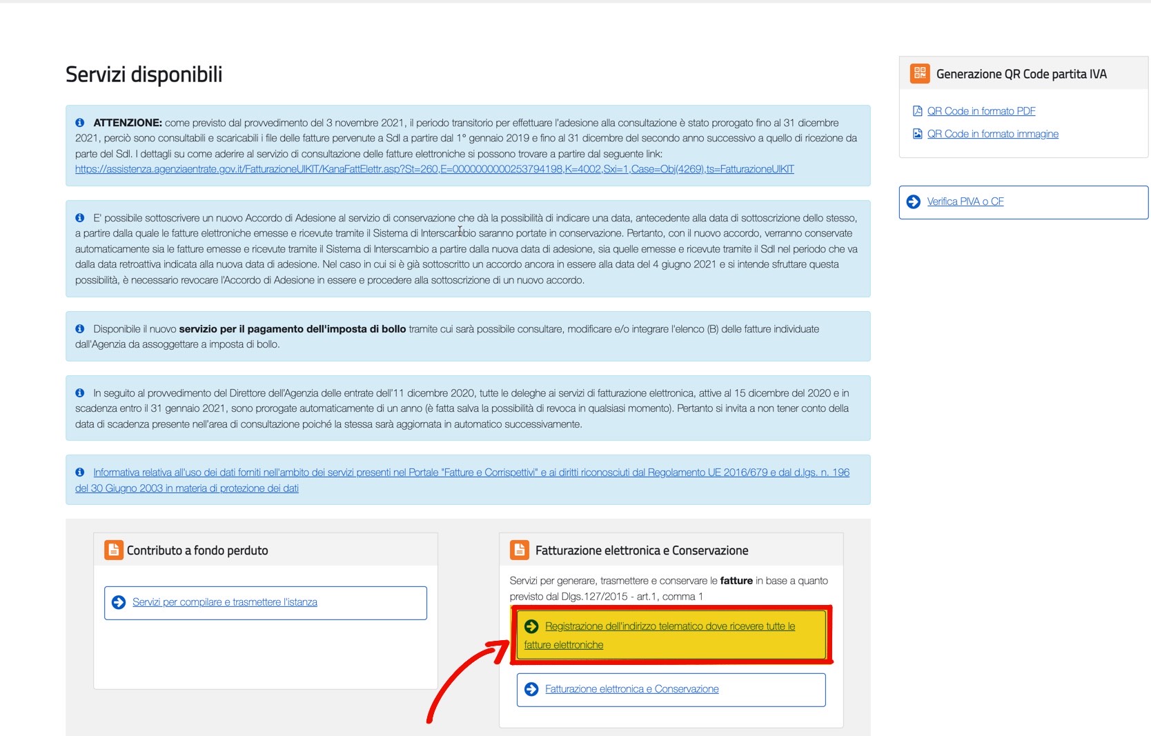 Vai alla sezione "Registrazione dell'indirizzo telematico dove ricevere le fatture elettroniche".