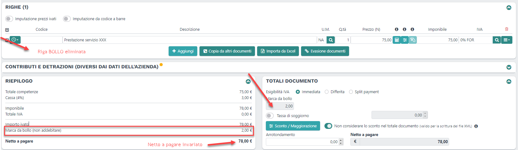 Nel caso in cui l’importo in fattura dovesse scendere sotto i 77,47 la riga relativa all’imposta di bollo verrà automaticamente eliminata.