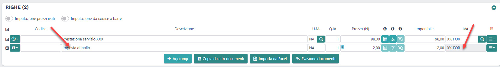 Per il regime RF19-Forfettario o RF02-Minimi se durante la compilazione della fattura hai inserito importi soggetti al bollo per un totale superiore a 77,47 euro, verrà creata in automatico una riga specifica per l’imposta di bollo associata all’aliquota: