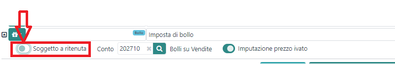Se non intendi assoggettare la quota del bollo ai contribuiti/detrazioni occorre spegnere il flag sul campo Soggetto a ritenuta, che si trova nell'espansione dei dati della riga del bollo.