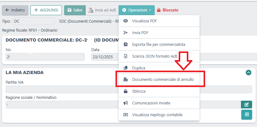 - Selezionare la voce Documento commerciale di annullo dal menu a Operazioni
