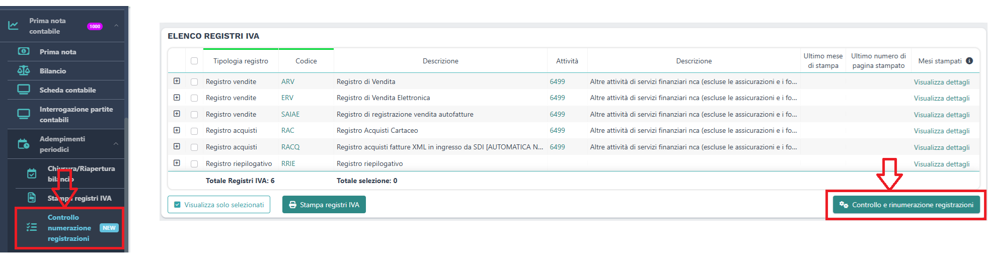 - dall'apposita voce di menu Prima nota contabile - Adempimenti periodici - Controllo numerazione registrazioni