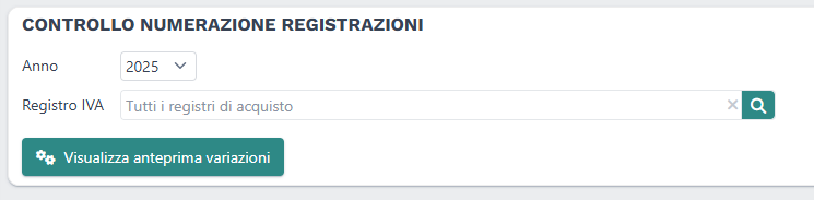 Nella pagina occorre selezionare l'anno per il quale eseguire il controllo delle numerazioni dei protocolli ed eventualmente uno specifico registro acquisti.