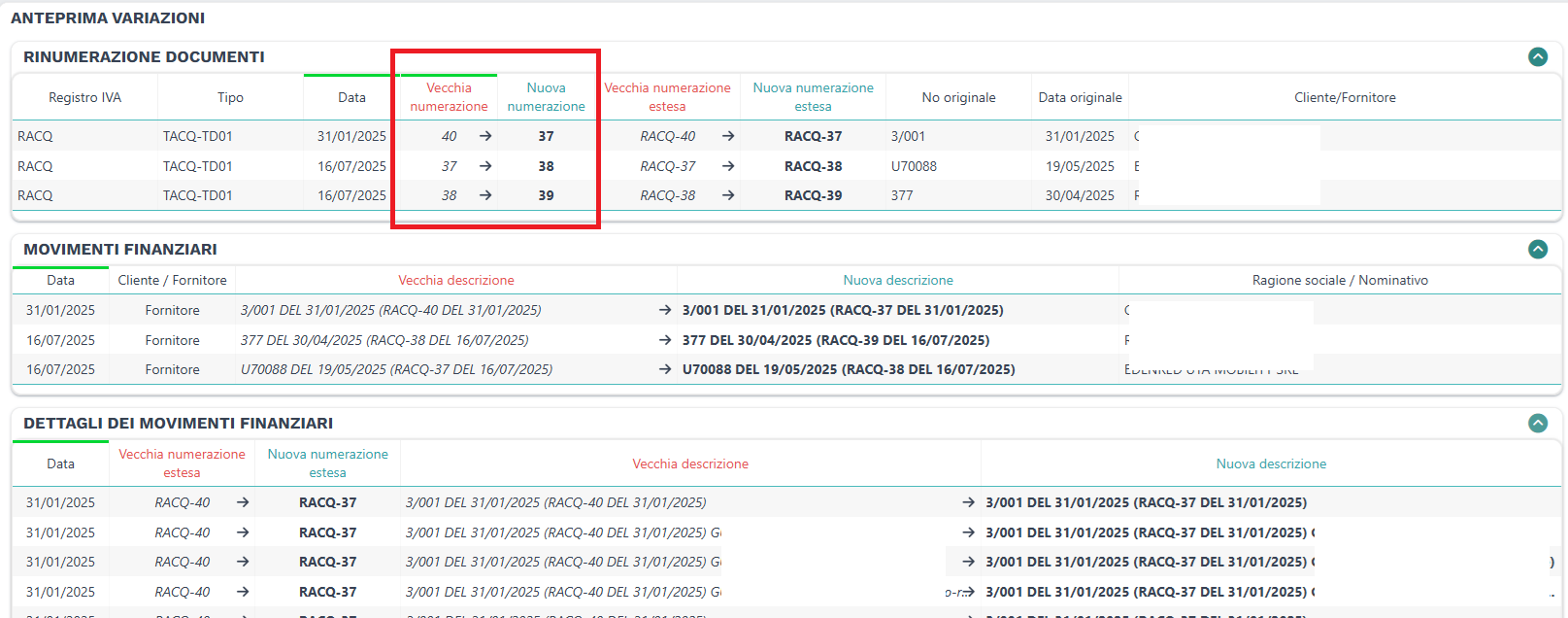 Cliccando sul bottone Visualizza anteprima variazioni viene avviato il controllo e se vengono rilevate delle incongruenze viene proposto un elenco con i documenti e le relative registrazioni contabili che necessitano di rinumerazione.