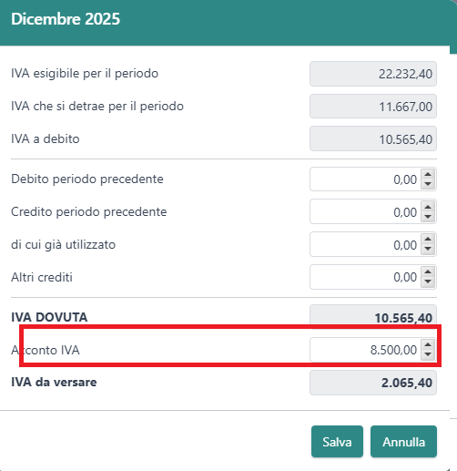 L'importo dell'IVA da versare (o a credito) verrà calcolato tenendo in considerazione l'acconto IVA versato